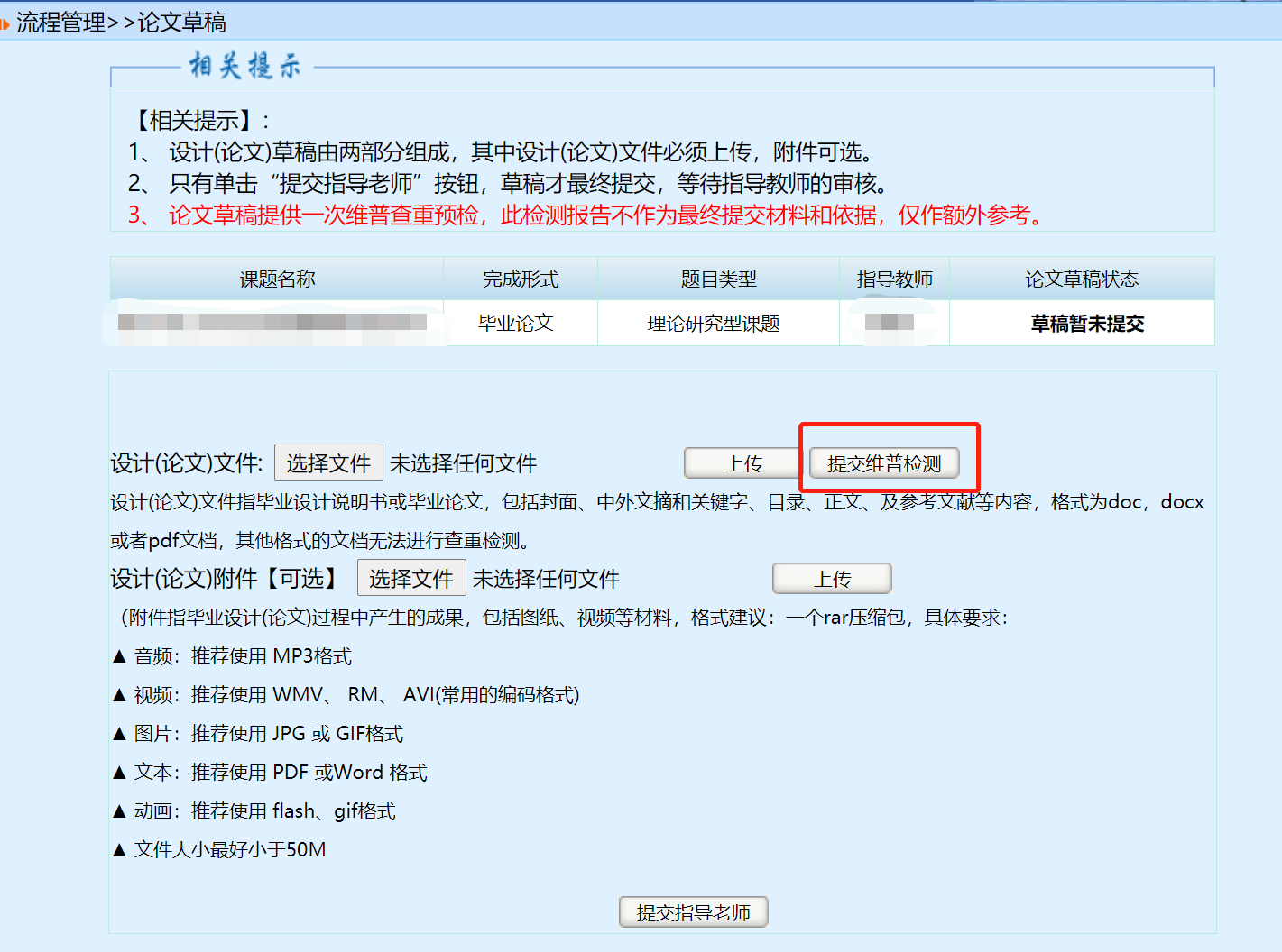 “流程管理—论文草稿—选择文件—上传—提交维普检测”